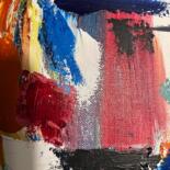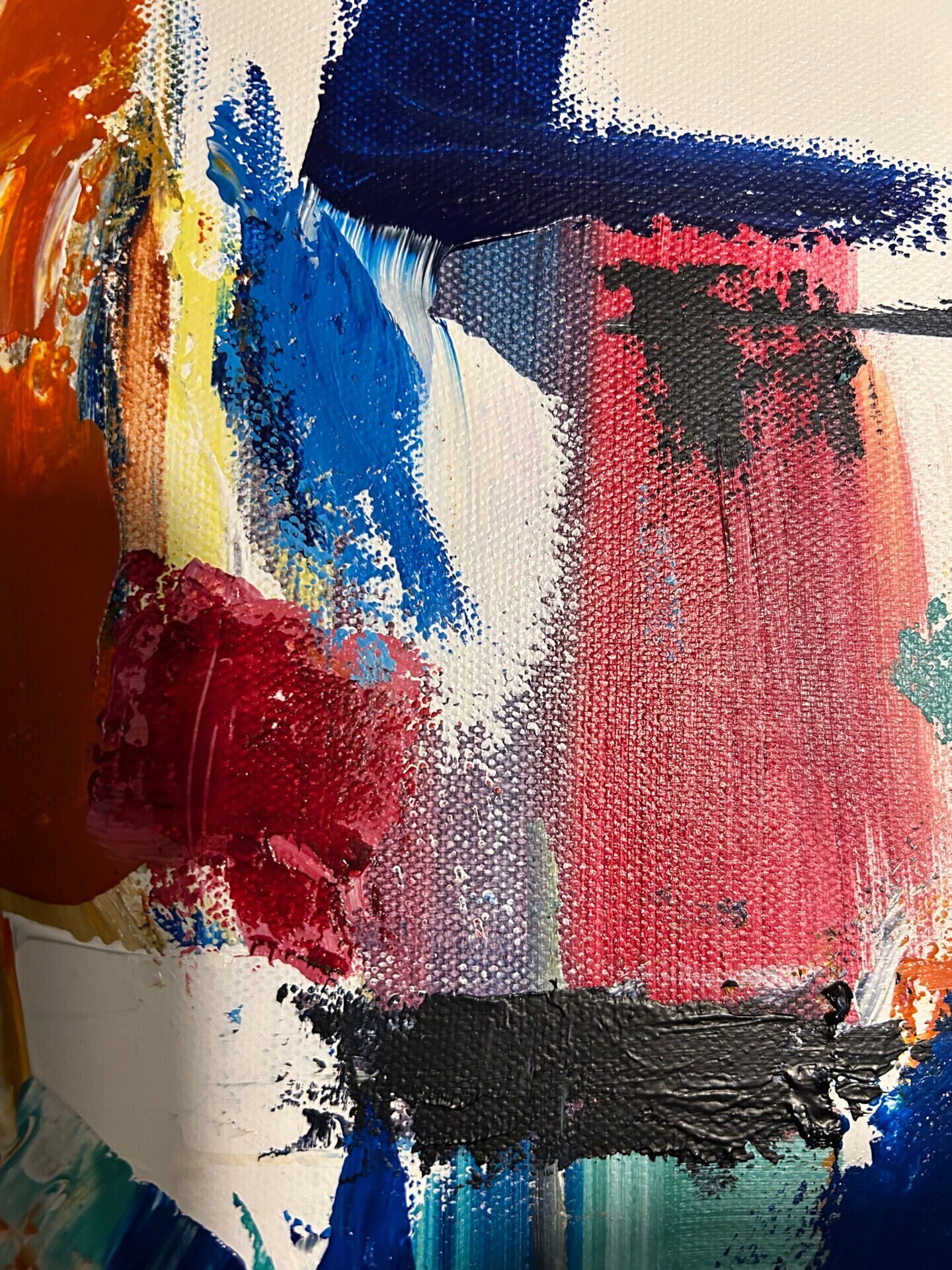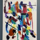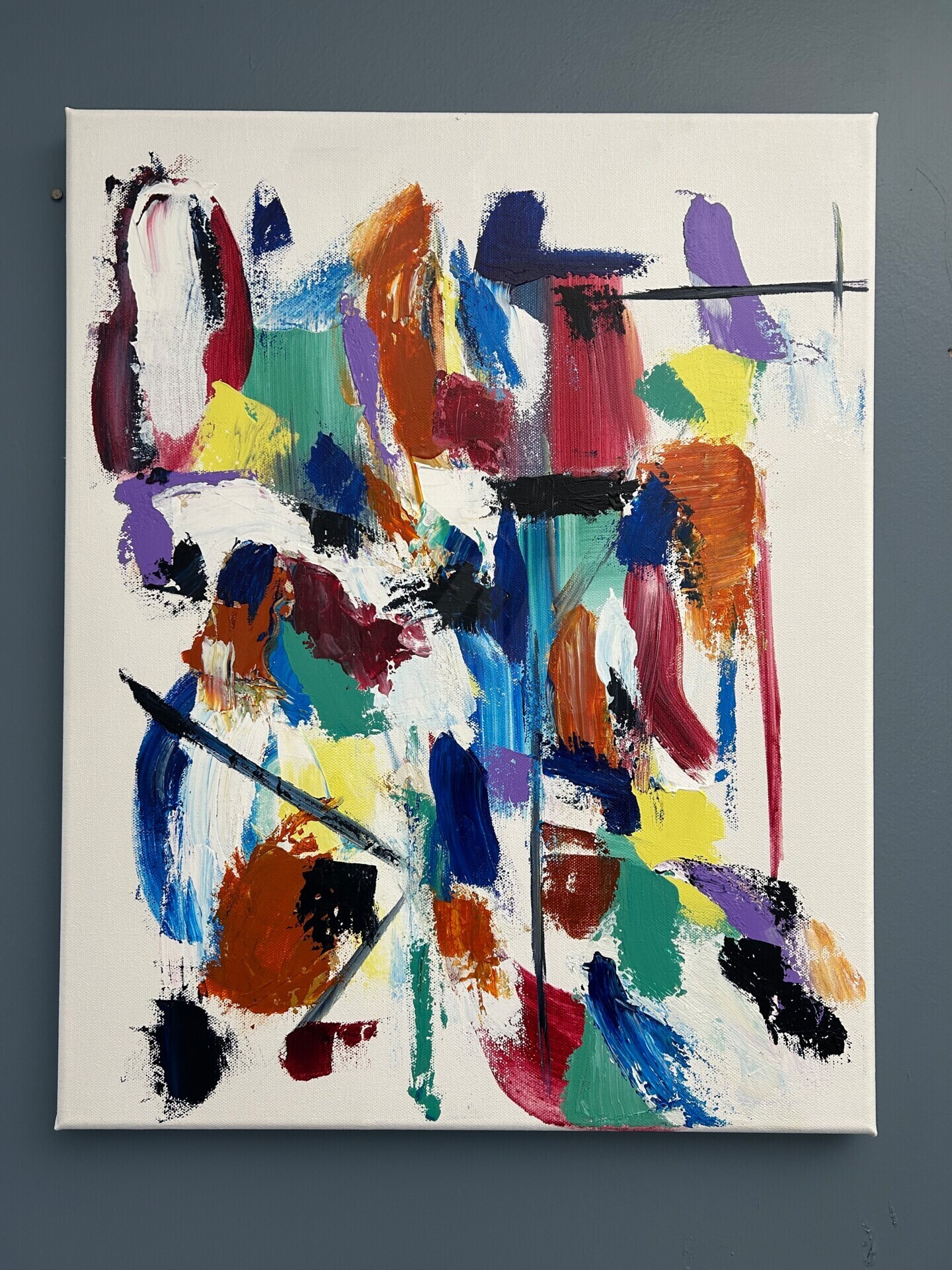 A dynamic abstract painting with swaths of overlapping bright colors broken up by dark patches and lines and empty spaces suggesting conflicting emotions and impulses.