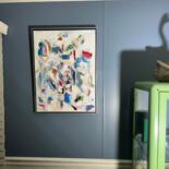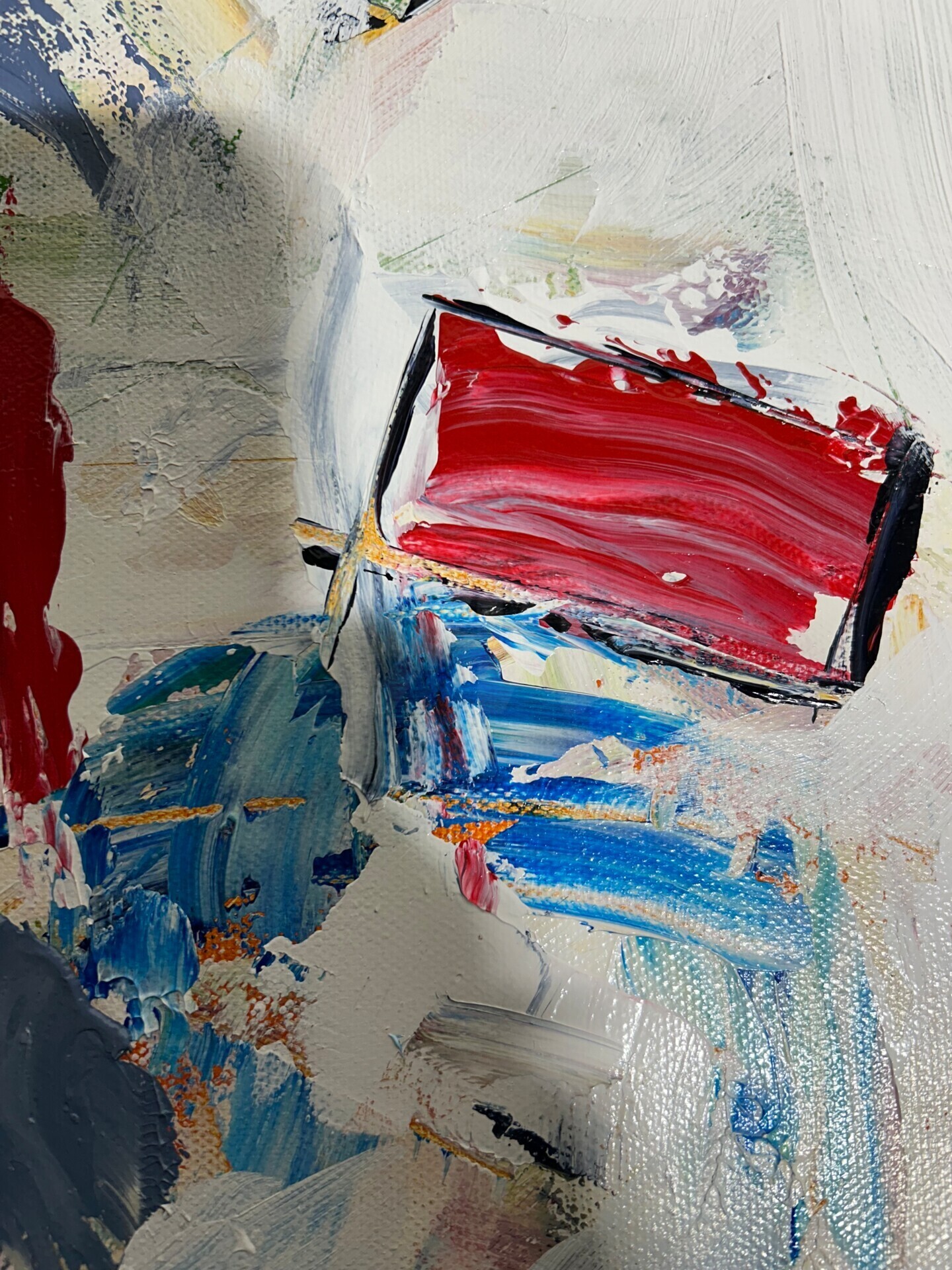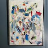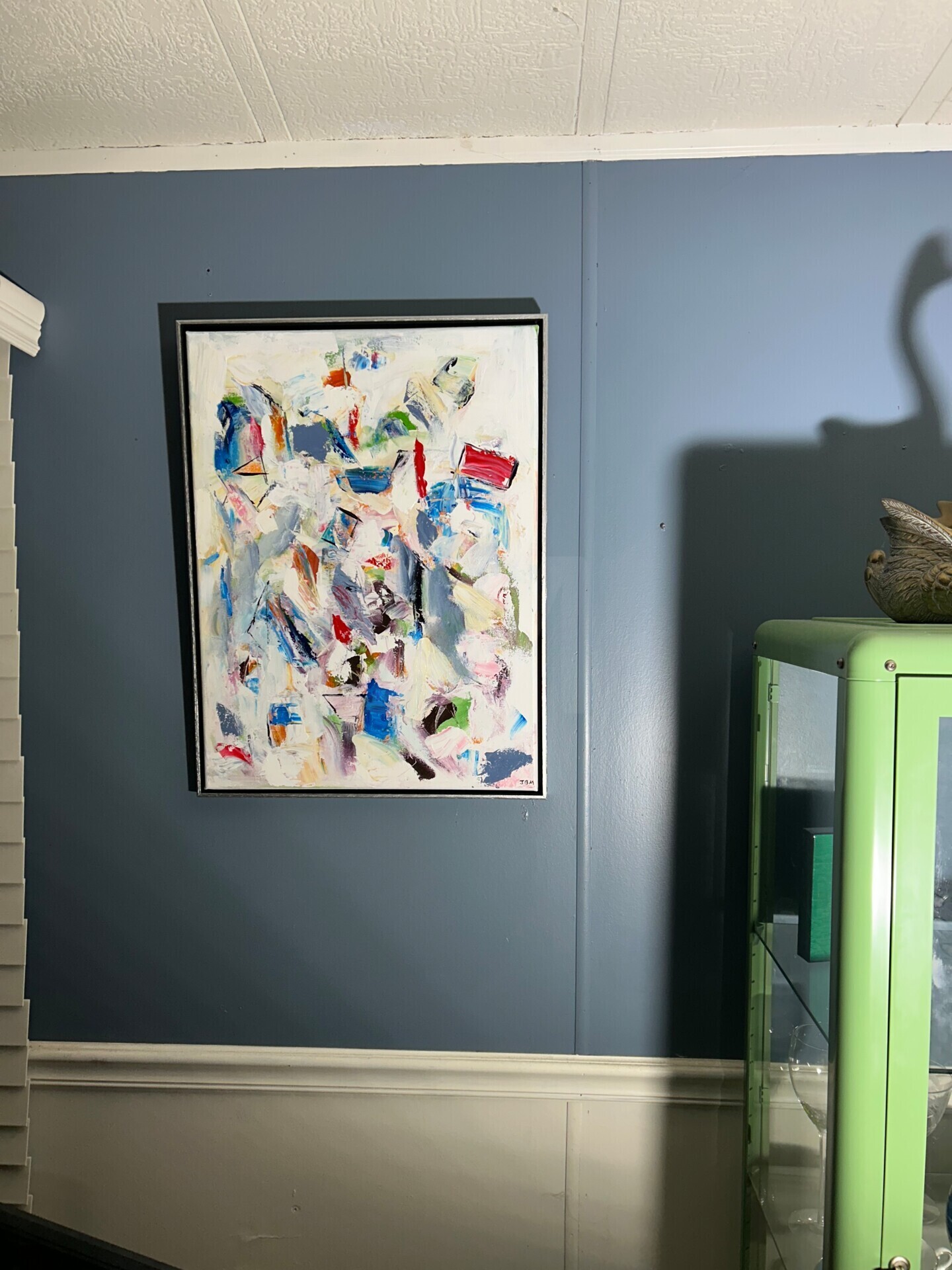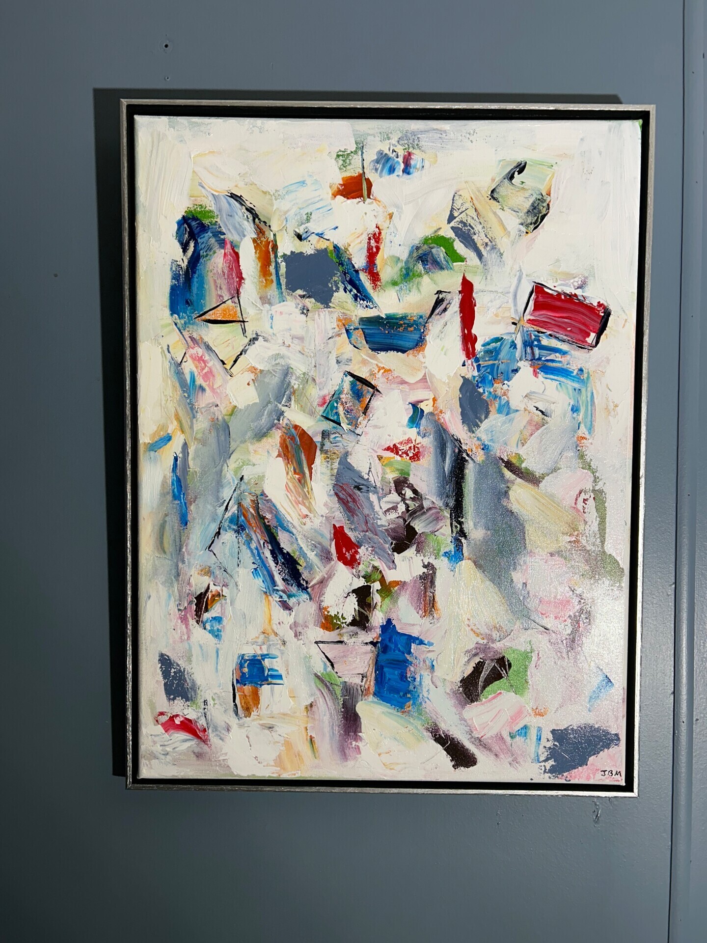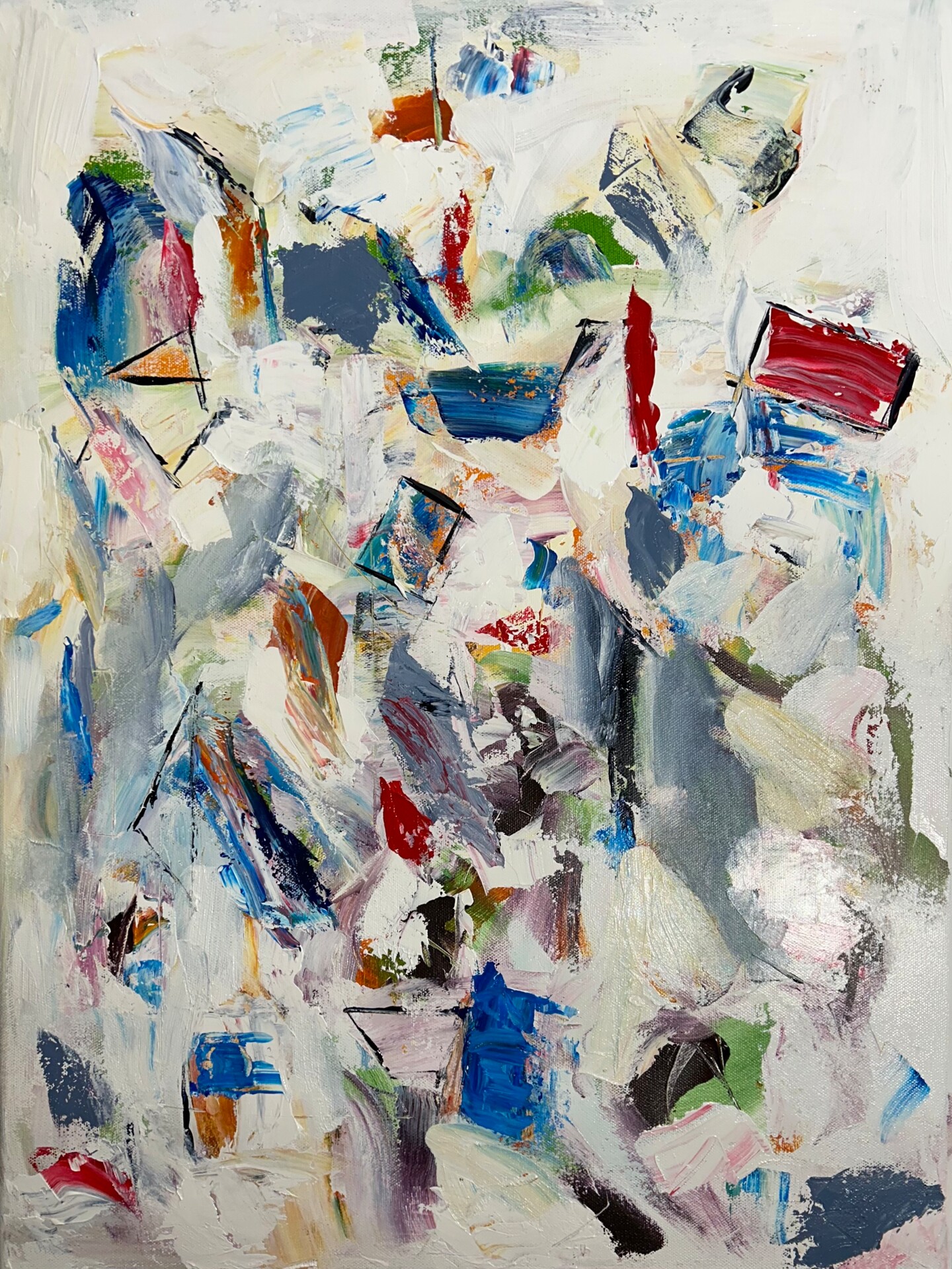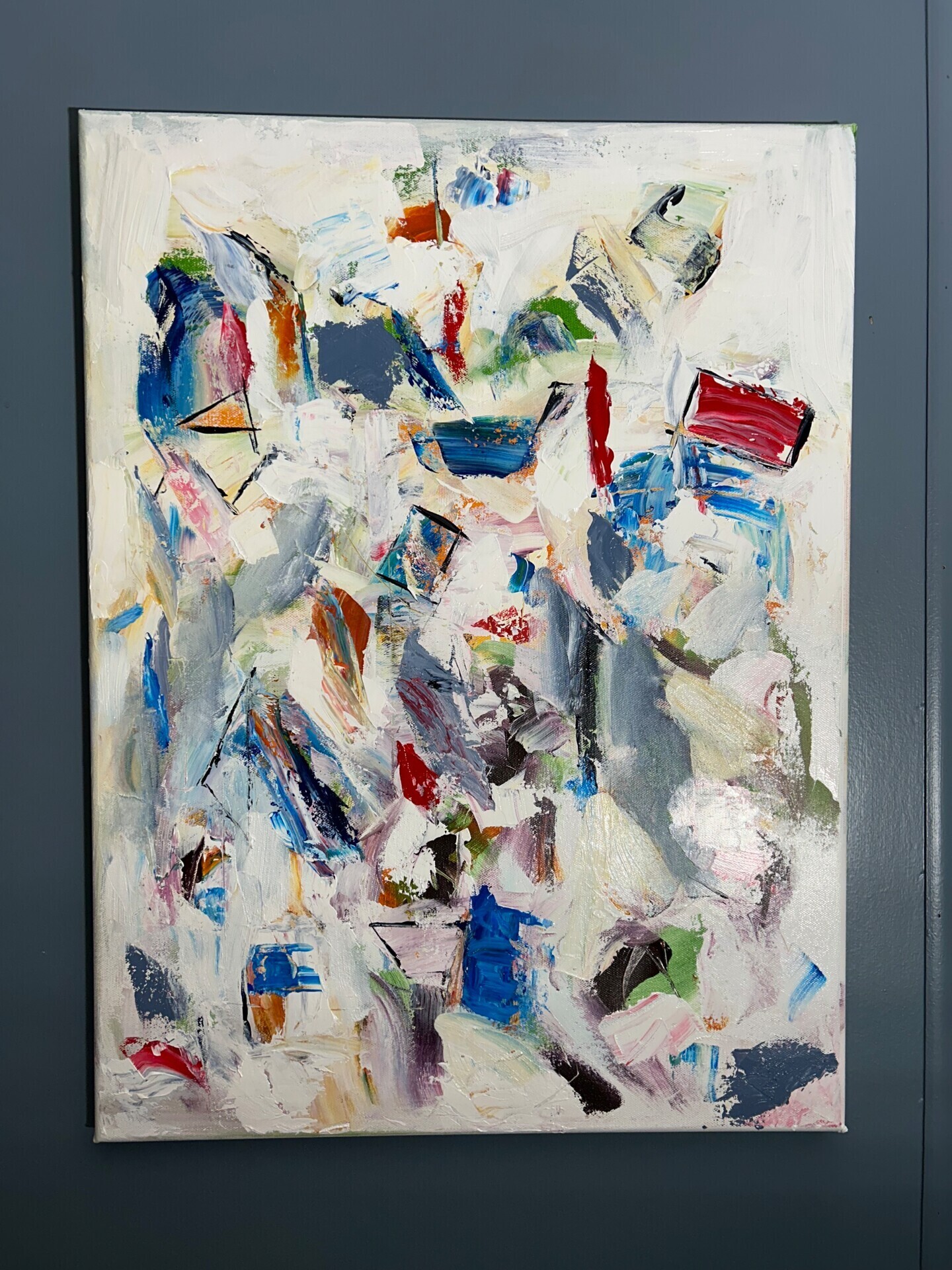 White dominating the painting with bursts of color breaking through evokes ideas of winter memories. The hints of structure from vague, broken geometric shapes hints at the unreliable nature of such memories.